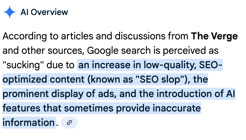 The (former) reliability of sources like the CDC has been especially important in the past few years because as you have probably noticed, search kind of sucks now. I'll let Google AI helpfully explain it for me (I was googling "verge why does google search suck" to see if they have a helpful article on the subject).
